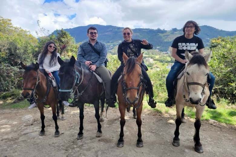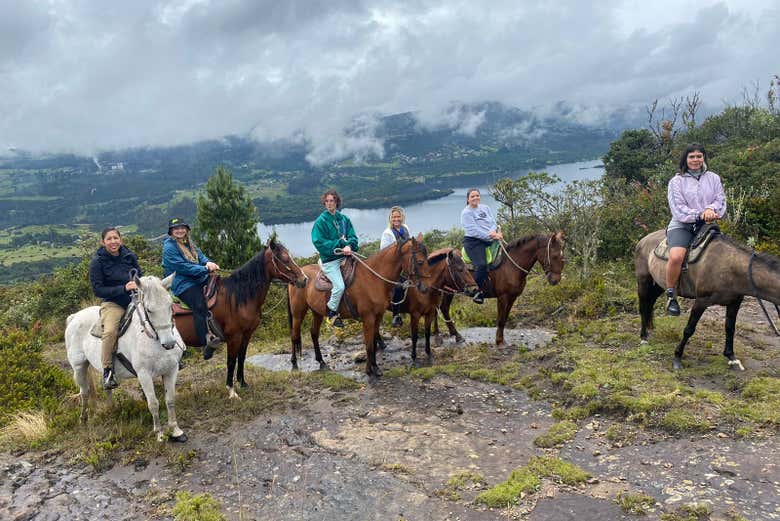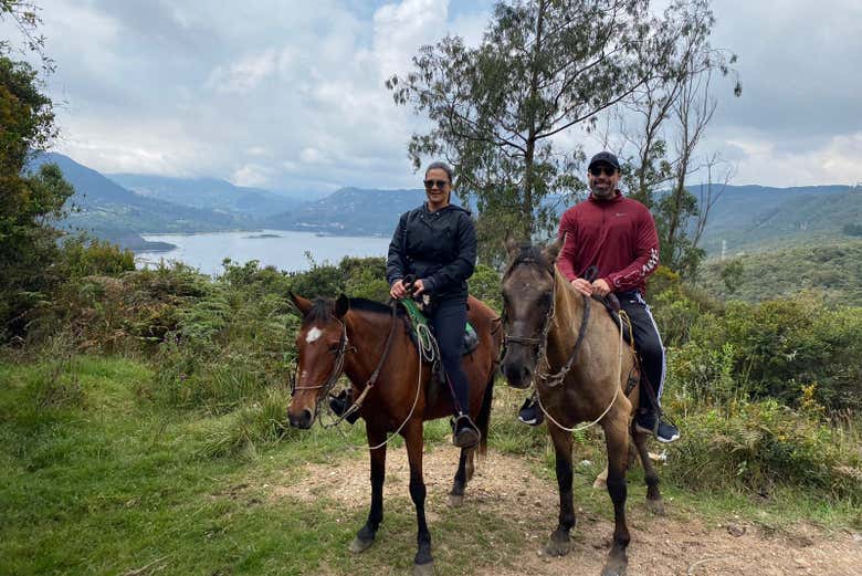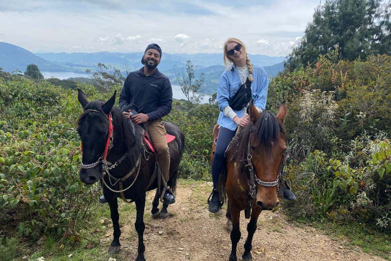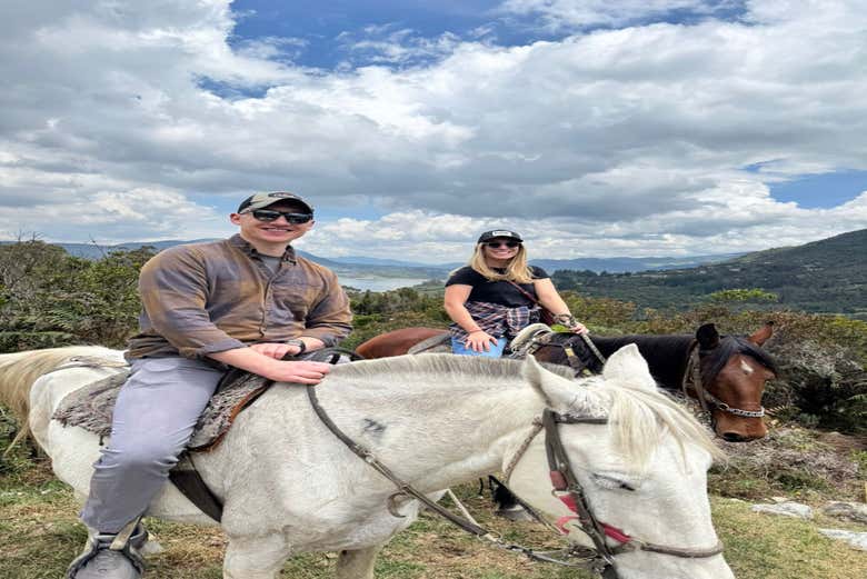- Passeio a cavalo (4 horas): Após nos reunirmos no ponto de encontro, seguimos para a região de La Calera. Uma breve caminhada de cinco minutos nos leva até os cavalos, onde faremos uma introdução e nos equipamos com capacetes. O passeio segue por trilhas suaves, adentrando a vegetação até um campo aberto com vistas panorâmicas da represa de San Rafael e do charmoso povoado de La Calera. No meio do caminho, uma pausa para um lanche típico antes de retornar ao ponto inicial em Bogotá.