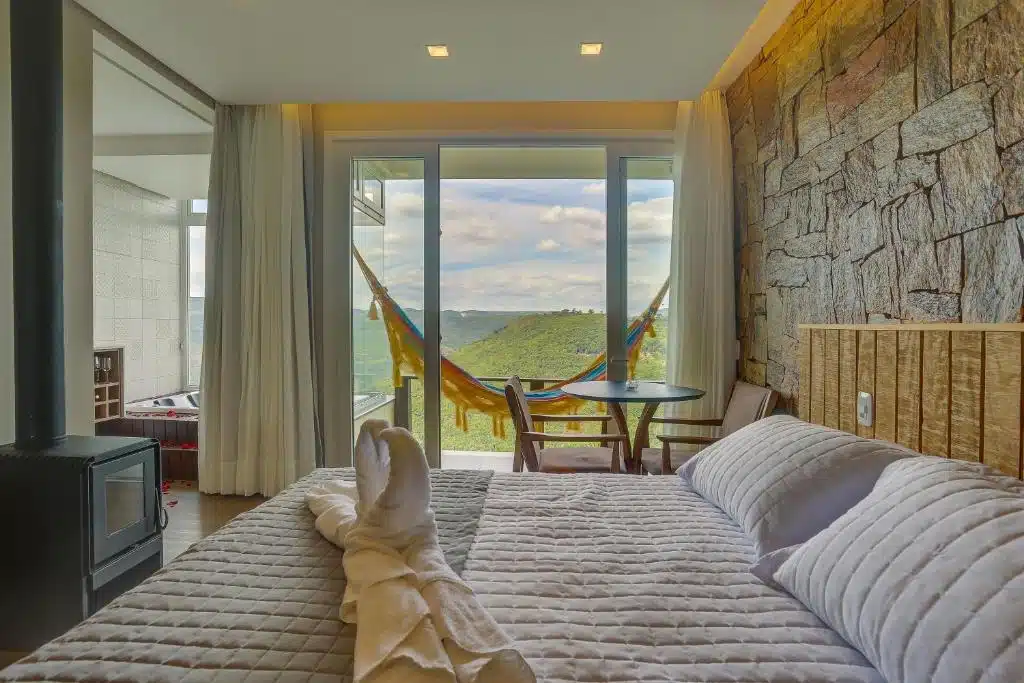 Para quem procura uma estadia com direito a uma bela paisagem vista pela janela, a Bina’s Haus Pousada, Cafeteria e Atelier é a opção ideal. Esta pousada conta com quartos aconchegantes decorados com peças artesanais e equipados com aquecimento e área para trabalho home office. Situado entre as montanhas da Serra Gaúcha, é o local perfeito para desfrutar o delicioso buffet de café da manhã na área externa da pousada. Ou mesmo aproveitar a lojinha de artesanato para sair dali munido de todo tipo de bibelô e souvenir da viagem! VER PREÇOS