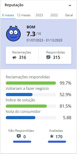 O Seguro Viagem Sulamerica possui uma boa reputação no Reclame Aqui, angariando uma nota 7,3. Praticamente todas as reclamações foram respondidas, com uma média de mais de 80% de índice de solução nos últimos seis meses. Apesar disso, apenas metade dos clientes voltariam a fazer negócio com a empresa. Contudo, é importante destacar que a seguradora não oferece somente planos para viagens, possuindo outros produtos que também são alvo na página.